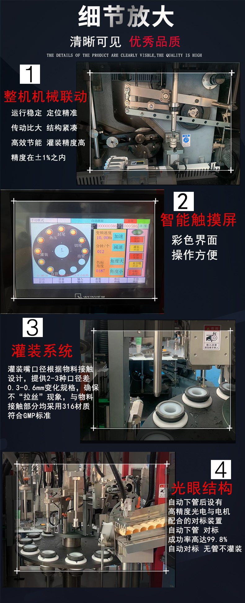 1、自動下管,填充加熱夾形成形(打碼)切尾,無管不充填。