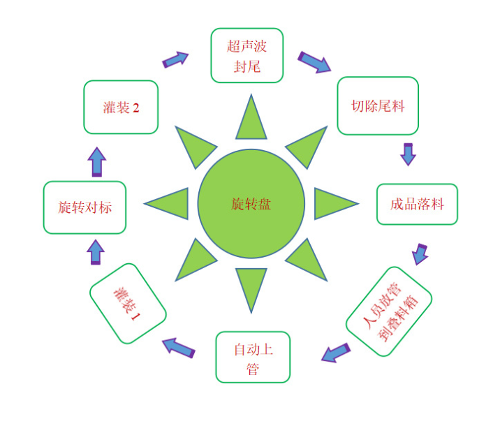 人工放管到疊料箱自動上管灌裝1旋轉對標灌裝2超聲波封尾切除尾料成品落料
